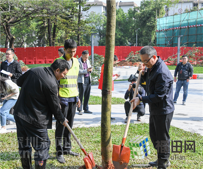 3月12日,福田区委、人大、政府、政协四套班子领导走进景蜜社区公园,挥锹播绿。