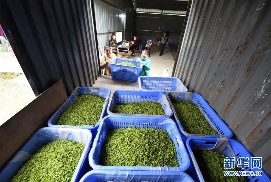 3月13日,在贵州省黎平县高屯街道高屯社区大江坡茶园,茶农在搬运春茶。新华社记者杨文斌 摄