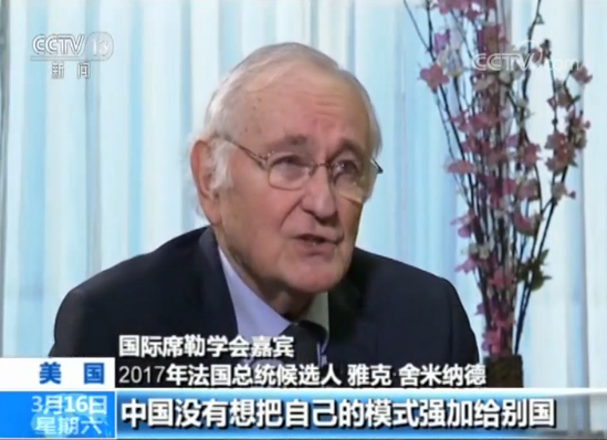 国际席勒学会嘉宾2017年法国总统候选人雅克·舍米纳德:中国模式提倡通过共同发展实现全球融合,习近平主席所说的合作共赢,这是人类的未来。中国没有想把自己的模式强加给别国,中国也不接受别国强加的发展模式。