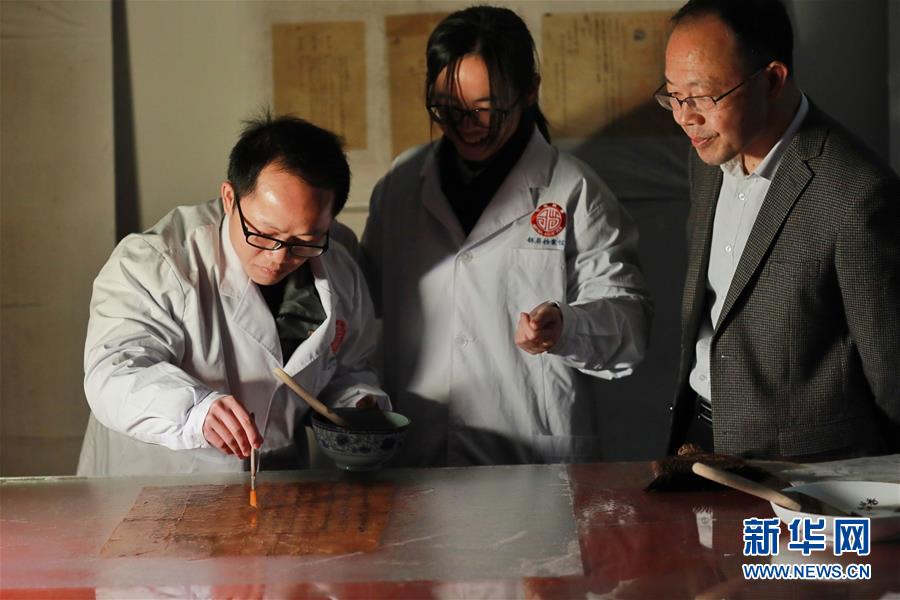 3月18日,王宗勋(右)在锦屏文书特藏馆内指导工作人员对锦屏文书进行裱糊。新华社记者欧东衢摄
