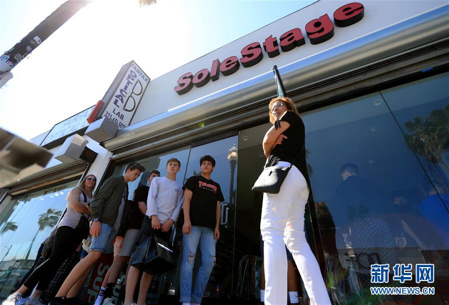 3月18日,在美国洛杉矶,顾客在一家潮牌店门口排队等待进入。在美国洛杉矶,从涂鸦到说唱,从潮鞋到街舞,四处可见街头文化的影子。在街头文化浓郁的费尔法克斯大街,25岁的中国小伙夏嘉欢创立了自己的潮牌店,售卖球鞋、球衣等流行服饰,吸引了众多当地热爱街头文化的年轻人光顾。新华社记者李颖摄
