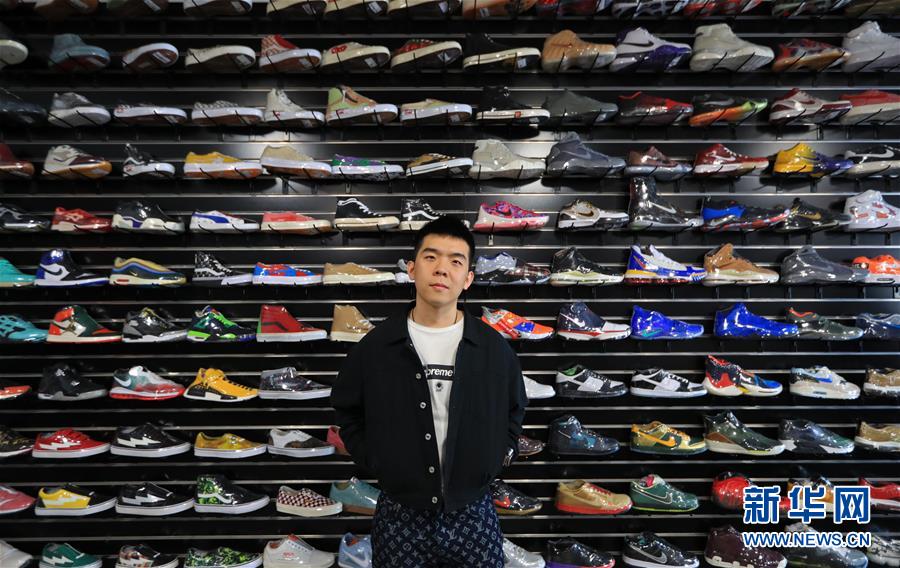3月18日,在美国洛杉矶,潮牌店店主夏嘉欢站在店内的“鞋墙”前。在美国洛杉矶,从涂鸦到说唱,从潮鞋到街舞,四处可见街头文化的影子。在街头文化浓郁的费尔法克斯大街,25岁的中国小伙夏嘉欢创立了自己的潮牌店,售卖球鞋、球衣等流行服饰,吸引了众多当地热爱街头文化的年轻人光顾。新华社记者李颖摄