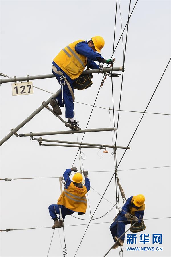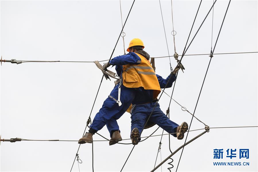 3月19日,两名工人在唐呼线张集段古营盘站场的铁路线网上进行作业。近日,为调整运输结构,增加铁路运输量,连接曹妃甸港和呼和浩特的唐呼线张集段正在进行万吨供电扩能改造工程。改造完工后,唐呼线将实现全年运量上亿吨的目标。唐呼线是我国西煤东运的重要通道之一,此次升级改造将缓解京津冀等沿线区域内重载卡车对道路交通和空气污染的影响。新华社记者刘磊摄