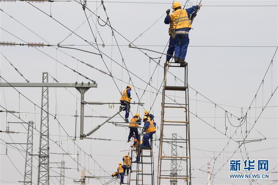 3月19日,工人们在唐呼线张集段古营盘站场进行线网改造。近日,为调整运输结构,增加铁路运输量,连接曹妃甸港和呼和浩特的唐呼线张集段正在进行万吨供电扩能改造工程。改造完工后,唐呼线将实现全年运量上亿吨的目标。唐呼线是我国西煤东运的重要通道之一,此次升级改造将缓解京津冀等沿线区域内重载卡车对道路交通和空气污染的影响。新华社记者刘磊摄
