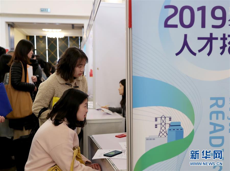 3月24日,求职者在招聘会上与招聘单位交流。当日,由上海、江苏、浙江、安徽联合举办的“长三角地区春季人才交流洽谈会暨2019届高校毕业生择业招聘会”在上海展览中心举行。新华社记者刘颖摄