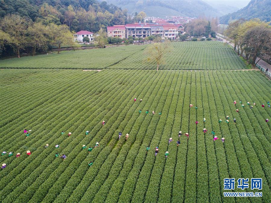 3月25日,茶农在杭州梅家坞村的茶园采摘西湖龙井“明前茶”(无人机拍摄)。3月下旬,浙江杭州西湖龙井茶一级保护区里的梅家坞村、龙井村、翁家山村等产茶区的茶农开始大面积采摘西湖龙井“明前茶”。据当地茶农介绍,由于今年春季雨水偏多,气温起伏较大,今年西湖龙井新茶的采摘期比去年略晚。新华社记者徐昱摄