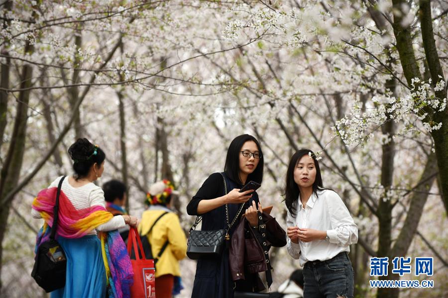 3月27日,游客在贵州省贵安新区樱花观光园赏花。仲春时节,位于贵州省贵安新区樱花观光园内的樱花竞相绽放,如白雪般的樱花海吸引众多游客前来赏花观光。新华社记者 杨文斌 摄