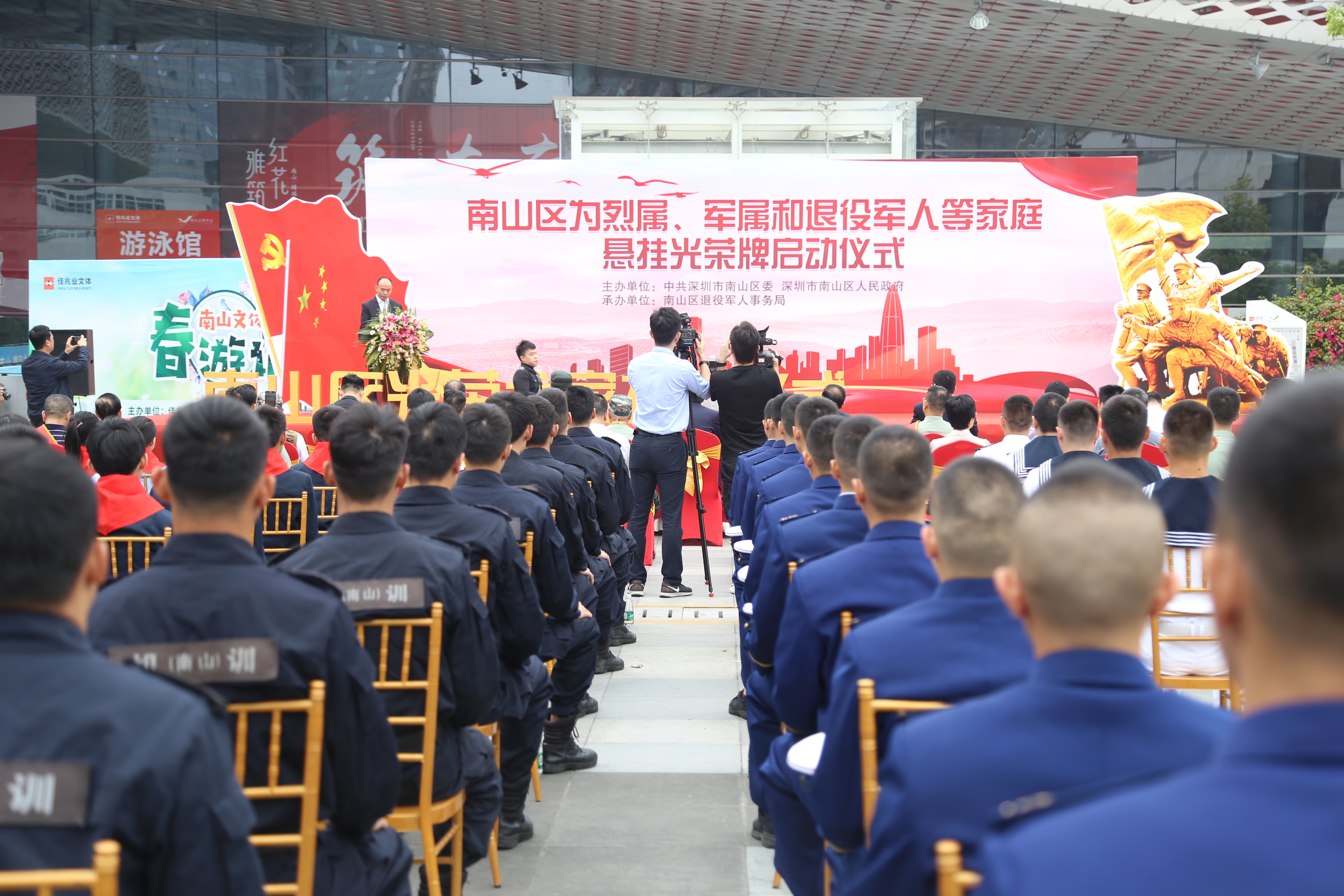 深圳新闻网讯(记者 曹文丽)为弘扬拥军优属优良传统,传递对烈属、军属和退役军人等家庭的关心关爱,4月1日上午,在南山区文体中心广场,南山区为烈属、军属和退役军人等家庭悬挂光荣牌启动仪式举行,正式开启南山“光荣之家”授牌悬挂工作,现场17名“光荣之家”家庭代表获颁光荣牌。南山区委副书记黄湘岳、南山区副区长谢炳文以及区委宣传部、区武装部、区退役军人事务局、区教育局、深圳湾边检站、各街道办事处等负责人以及驻区解放军、武警代表、学生代表共计500余人共同见证这一荣耀时刻。