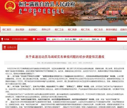 中新网2019年4月2日电 针对3月27日晚柔道运动员马端斌实名举报刘忠军、刘忠和贪腐等问题一事,桓仁满族自治县人民政府专项调查组4月2日发布初步调查情况通报。通报提到,目前,被举报人刘忠和已被停职。另外,在调查过程中还发现被举报人刘忠军有滥伐幼林的问题,公安机关已对其立案侦查。