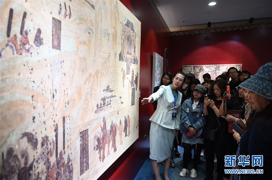 4月10日,敦煌研究院文化弘扬部的讲解员马琳(左)为参观者仔细讲解壁画文化。当日,“敦煌穿越千年的永恒——敦煌壁画艺术精品高校公益巡展”在云南大学开幕。此次展览选取敦煌石窟近50幅精美的壁画,分别以尊像、建筑、图案、飞天、民俗生活等极具代表性的专题,充分展现了敦煌壁画的艺术魅力。该系列展已陆续在全国30多个高校举办,取得了良好的效果。新华社记者秦晴摄