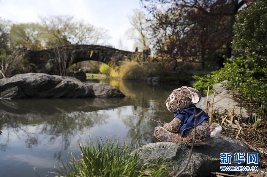 4月13日,在美国纽约中央公园,一只玩偶“坐”在池塘边。当日天气回暖,纽约中央公园春意盎然,吸引了众多游人前来赏花踏青。新华社记者王迎摄