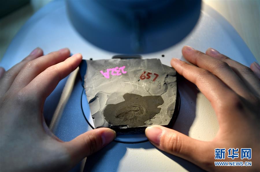 西北大学地质学系的学生用显微镜对“清江生物群”中的化石进行观察研究(4月8日摄)。新华社记者刘潇摄