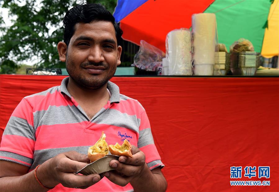 4月17日,在印度首都新德里市区一处街边食品摊,一名男子展示买来的印度传统食品萨莫萨。萨莫萨是将土豆蒸熟做成糊状,加入豌豆、盐和香料调成馅儿,用和好的面粉包起来捏成三角形状,放入油锅炸熟而成,吃的时候可根据各人口味配以辣椒汁或咖喱汁等佐料。萨莫萨价格便宜,很受当地人喜爱。新华社记者张迺杰摄