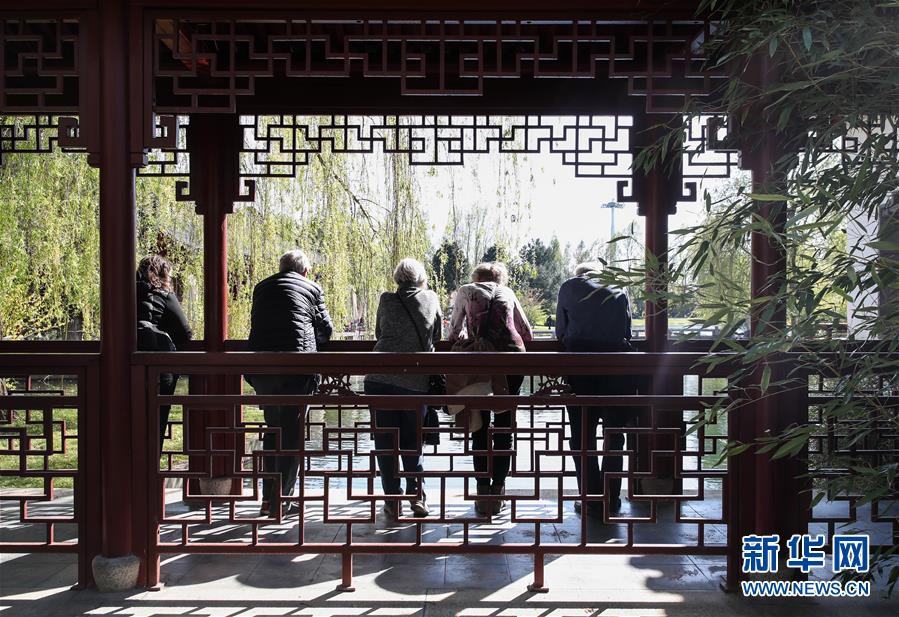 4月17日,在德国首都柏林,游客在“得月园”内参观。