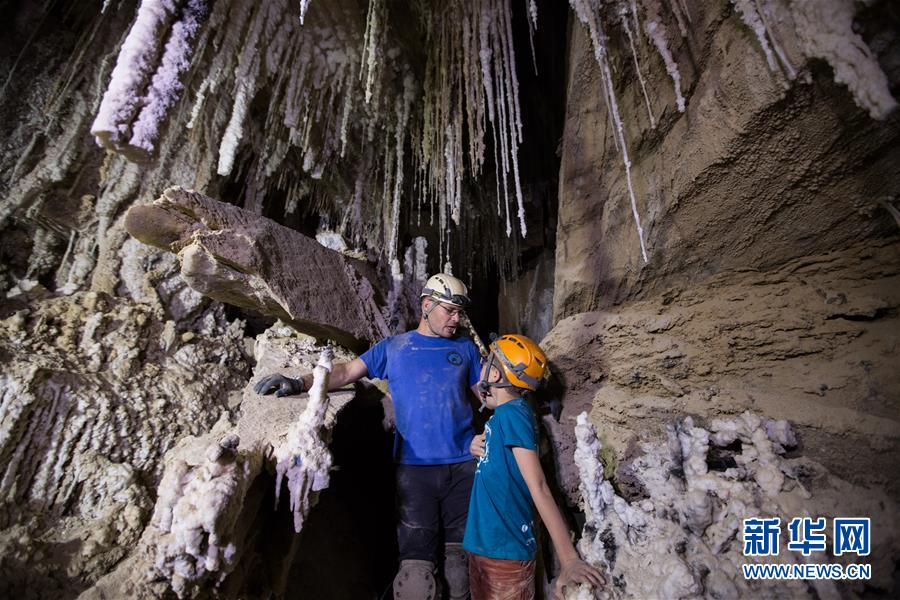 4月14日,在位于死海南端的以色列迈勒海姆盐洞内,来自以色列洞穴探索俱乐部的约阿夫·内盖夫(左)介绍盐洞情况。以色列洞穴研究专家近日宣布,他们与来自其他国家的洞穴探索者合作勘查发现,位于死海地区的以色列迈勒海姆洞长10公里,是世界上最长的盐洞。这个盐洞最初由以色列希伯来大学洞穴研究中心专家上世纪80年代在绵延11公里的塞多姆山里发现。塞多姆山位于死海西南端,比海平面低170米。山体几乎全部由盐构成,只覆盖薄薄一层岩石。每年冬季,雨水渗入山石缝隙,溶解盐分,不断形成新的洞穴。新华社记者郭昱摄