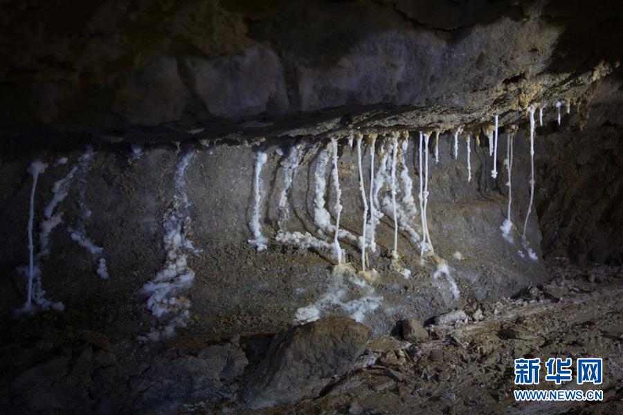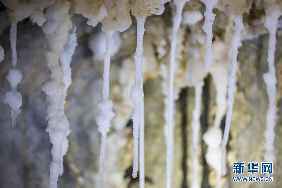这是4月14日在位于死海南端的以色列迈勒海姆盐洞内拍摄的盐钟乳石。以色列洞穴研究专家近日宣布,他们与来自其他国家的洞穴探索者合作勘查发现,位于死海地区的以色列迈勒海姆洞长10公里,是世界上最长的盐洞。这个盐洞最初由以色列希伯来大学洞穴研究中心专家上世纪80年代在绵延11公里的塞多姆山里发现。塞多姆山位于死海西南端,比海平面低170米。山体几乎全部由盐构成,只覆盖薄薄一层岩石。每年冬季,雨水渗入山石缝隙,溶解盐分,不断形成新的洞穴。新华社记者郭昱摄