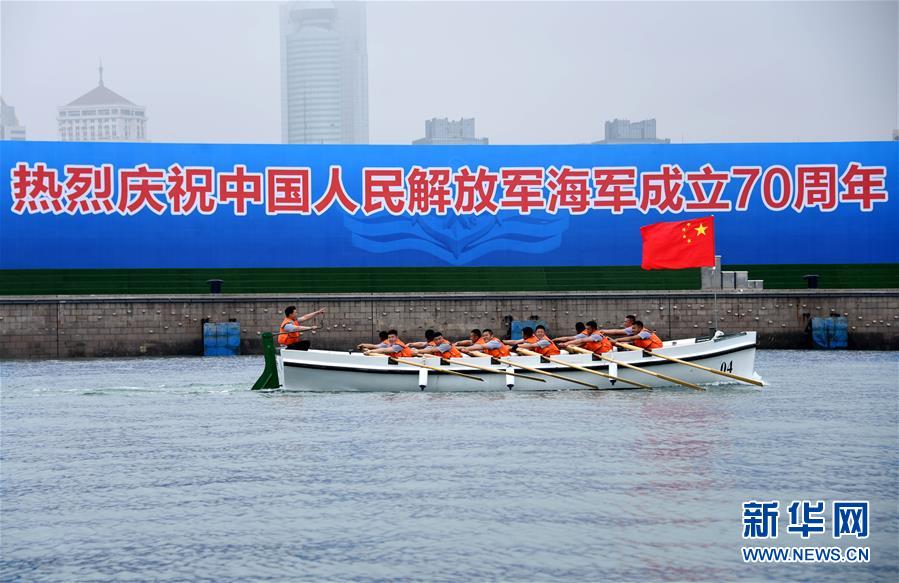 4月24日,中国海军代表队在比赛中。当日,中国人民解放军海军成立70周年多国海军活动舢板比赛在青岛奥林匹克帆船中心举行,8支来自各国的参赛队伍展开角逐,最终中国海军代表队获得冠军。新华社记者李紫恒摄