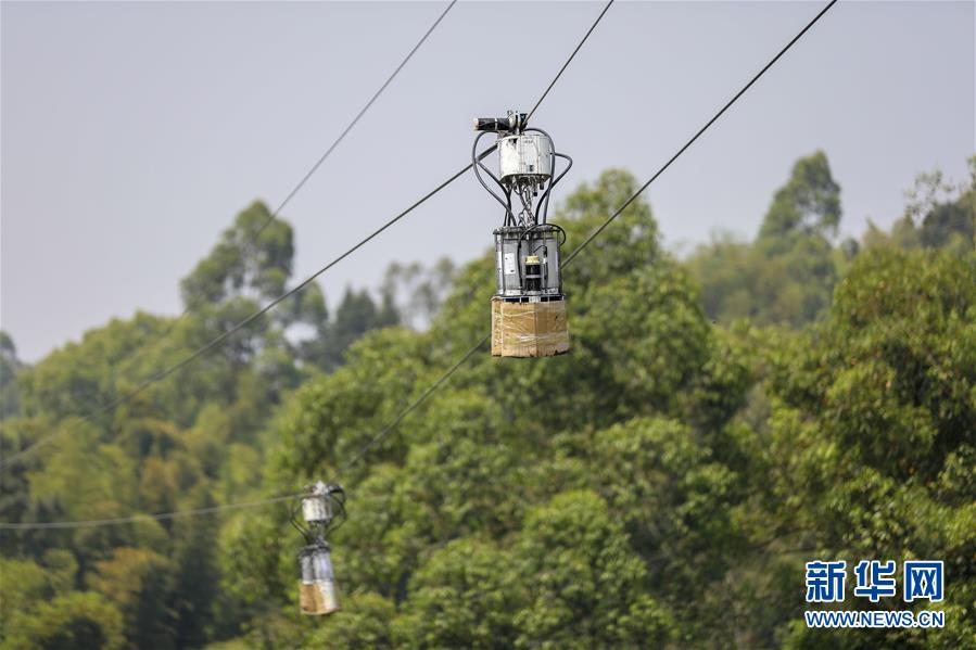 高空智能机器人在裸露的电力导线上进行绝缘化涂覆作业(4月25日摄)。4月25日,国家电网重庆市电力公司引进的重庆首批导线绝缘化涂覆高空智能机器人在重庆市永川区正式上岗作业。这款高空智能机器人挂载绝缘材料原料罐后,可在高压输电线上按照指令,为裸露导线披上黑色“绝缘防护外衣”,涂覆后的绝缘材料在性能等各方面都与绝缘导线无差别。这款新型高空智能机器人的上岗,能够大幅减少绝缘电力导线更换的时间,降低电力导线绝缘改造难度。新华社记者刘潺摄