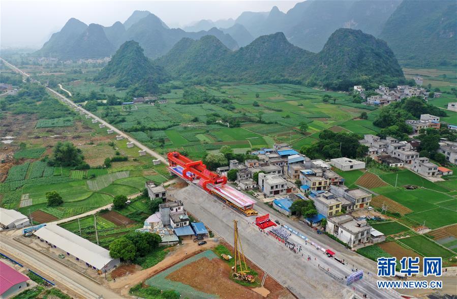 这是贵南高铁澄江双线特大桥首榀箱梁架设现场(4月29日摄)。当日,贵(阳)南(宁)高铁广西都安瑶族自治县境内的澄江双线特大桥架设首榀箱梁,也是贵南高铁全线架设的首榀箱梁。贵南高铁正线全长约512公里,其中新建线路482公里,设计行车时速350公里,是我国西南山区第一条设计时速350公里的高速铁路,也是我国“八纵八横”铁路网的重要组成部分,预计2023年全线建成通车。新华社记者陆波岸摄