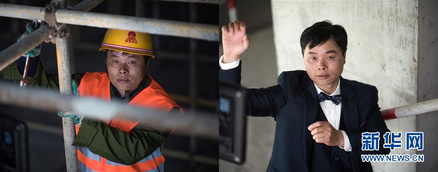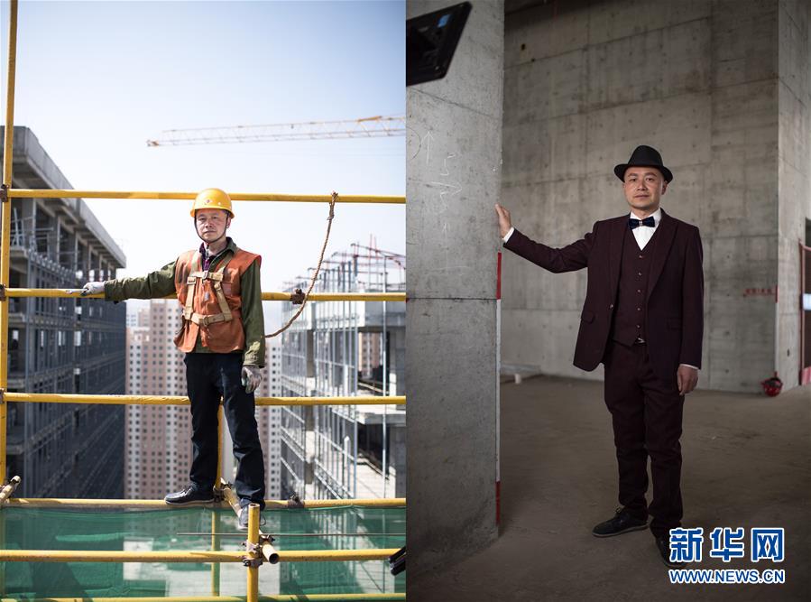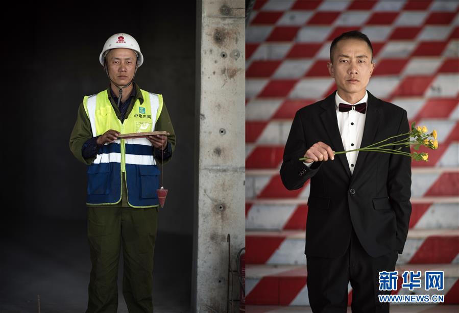 拼版照片:左图为4月27日,青海省西宁市中建三局联通通信综合楼项目木工黄仁义在工地上;右图为4月27日拍摄的黄仁义的写真照片。在“五一”国际劳动节来临之际,中建三局为青海省西宁市几处工地的工人选购礼服。新华社记者拍摄了他们的工作照和写真照,展示劳动者之美。 新华社记者 吴刚 摄