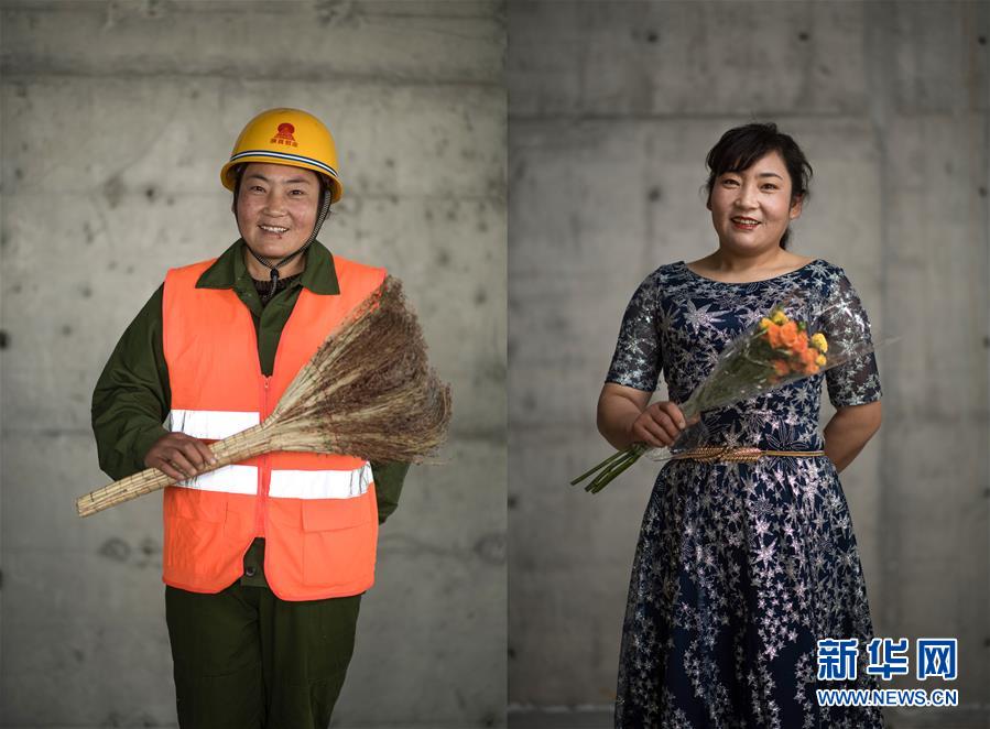 拼版照片:左图为4月27日,青海省西宁市中建三局联通通信综合楼项目保洁员王改颜在工地内准备清扫楼层垃圾;右图为4月27日拍摄的王改颜的写真照片。在“五一”国际劳动节来临之际,中建三局为青海省西宁市几处工地的工人选购礼服。新华社记者拍摄了他们的工作照和写真照,展示劳动者之美。 新华社记者 吴刚 摄