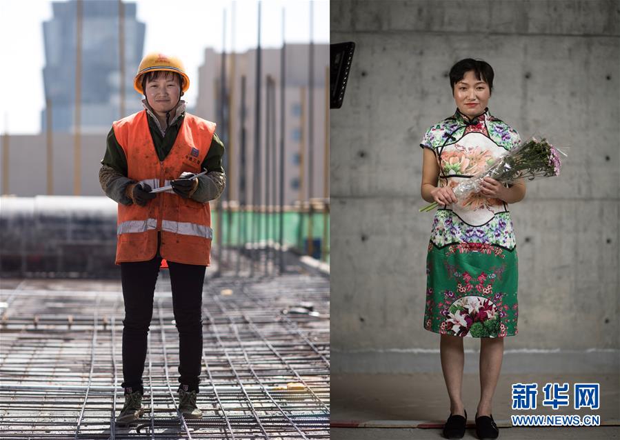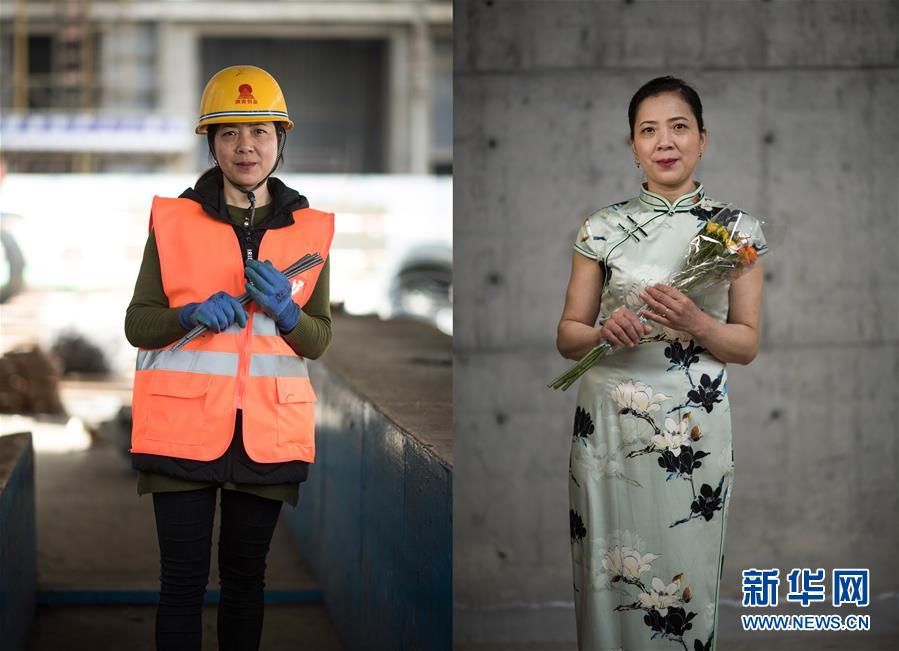 拼版照片:左图为4月27日,青海省西宁市中建三局联通通信综合楼项目钢筋女工刘彩霞在工地上;右图为4月27日拍摄的刘彩霞的写真照片。在“五一”国际劳动节来临之际,中建三局为青海省西宁市几处工地的工人选购礼服。新华社记者拍摄了他们的工作照和写真照,展示劳动者之美。 新华社记者 吴刚 摄