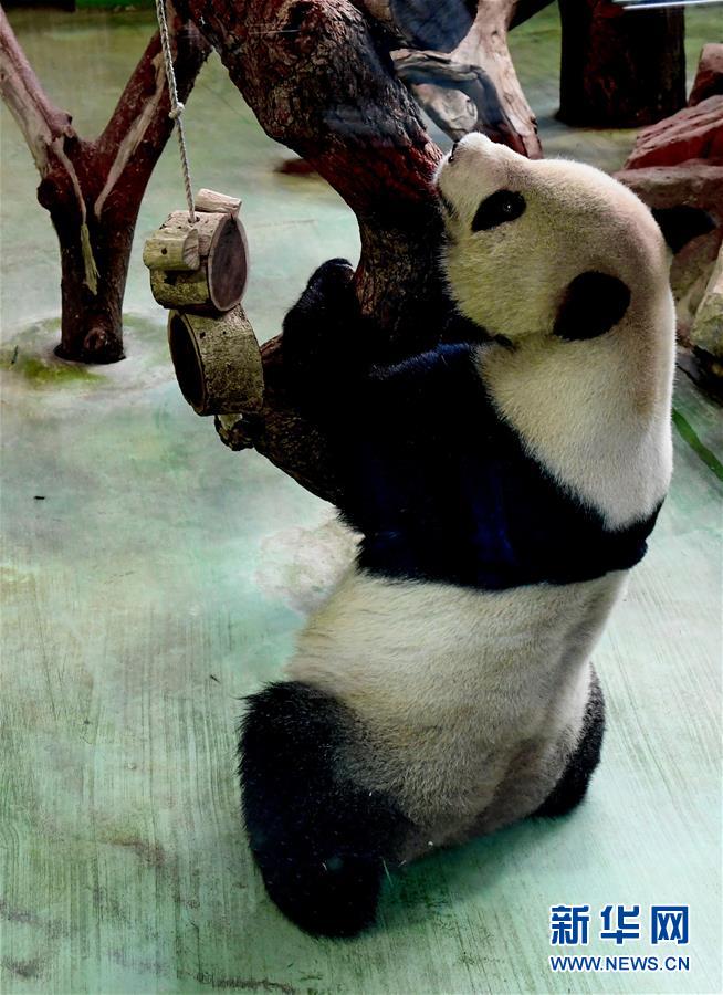 大熊猫“圆圆”在台北动物园熊猫馆玩耍(4月28日摄)。新华社记者张国俊摄