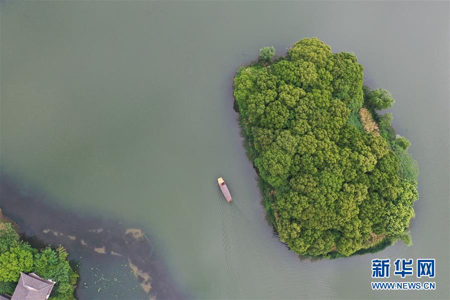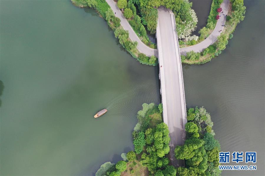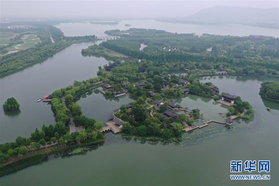无人机航拍的尚湖风景区景色(5月19日摄)。太湖风景名胜区重要组成部分——江苏常熟尚湖风景区,是国家5A级景区、国家城市湿地公园。近年来,尚湖风景区依托优美的自然风景,积极打造一流的山水旅游度假胜地。新华社记者季春鹏摄