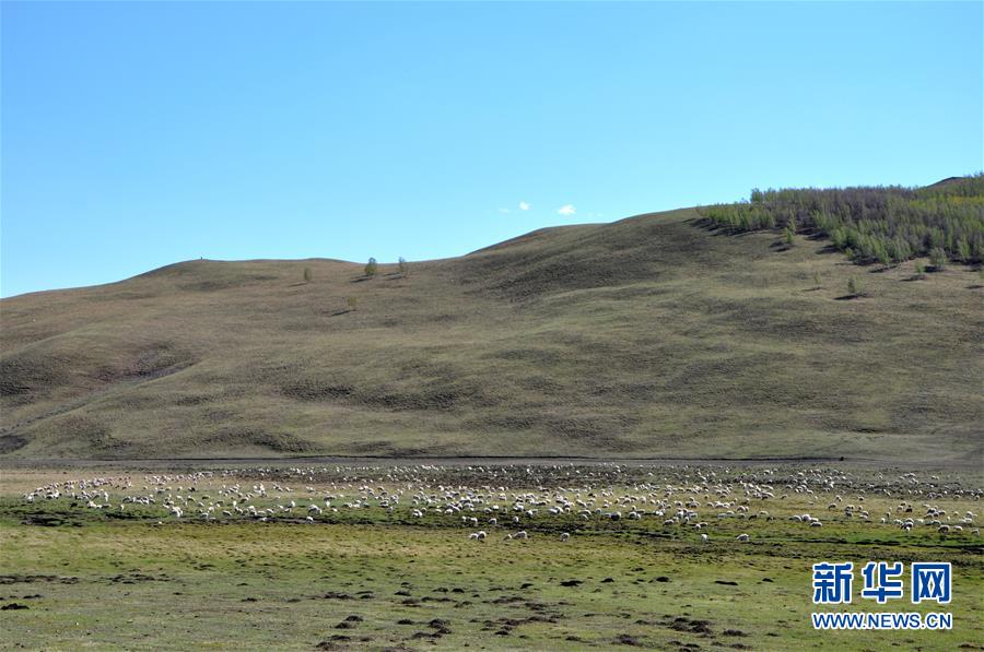 5月22日,羊群在内蒙古兴安盟境内的草原上吃草。近期,随着降雨量增多、气温回暖,内蒙古草原陆续进入返青期。新华社记者殷耀摄