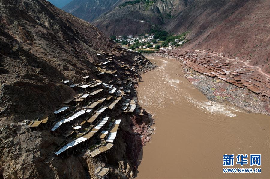 5月22日,村民在依山而架的古盐田里劳作。位于西藏昌都芒康县澜沧江畔的古盐田,至今仍保持最原始的手工晒盐方式。据史料记载,唐朝时期当地就开始晒盐。盐田在澜沧江两岸依山而建,由多根木柱搭架,架上用透水性强的泥土铺成平面夯实,当地居民从澜沧江畔的盐井、盐池中取出卤水倒入盐田,经阳光蒸晒、风干,结晶成盐。远远望去,盐田错落有致,田中卤水宛若镜面,形成壮丽奇观。新华社记者 李鑫摄