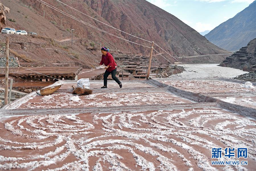 5月22日,西藏纳西民族乡加达村村民拉措在盐田上收盐。位于西藏昌都芒康县澜沧江畔的古盐田,至今仍保持最原始的手工晒盐方式。据史料记载,唐朝时期当地就开始晒盐。盐田在澜沧江两岸依山而建,由多根木柱搭架,架上用透水性强的泥土铺成平面夯实,当地居民从澜沧江畔的盐井、盐池中取出卤水倒入盐田,经阳光蒸晒、风干,结晶成盐。远远望去,盐田错落有致,田中卤水宛若镜面,形成壮丽奇观。新华社记者 李鑫摄