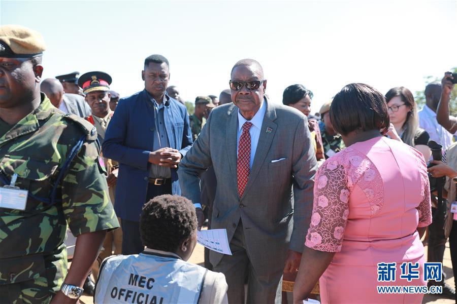 这是马拉维现任总统、民主进步党领导人彼得·穆塔里卡(中)在南部乔洛地区一处投票站参加投票的资料照片(5月21日摄)。马拉维选举委员会27日在布兰太尔公布了21日举行的总统选举结果,现任总统、民主进步党领导人彼得·穆塔里卡成功连任,任期5年。新华社记者彭立军摄