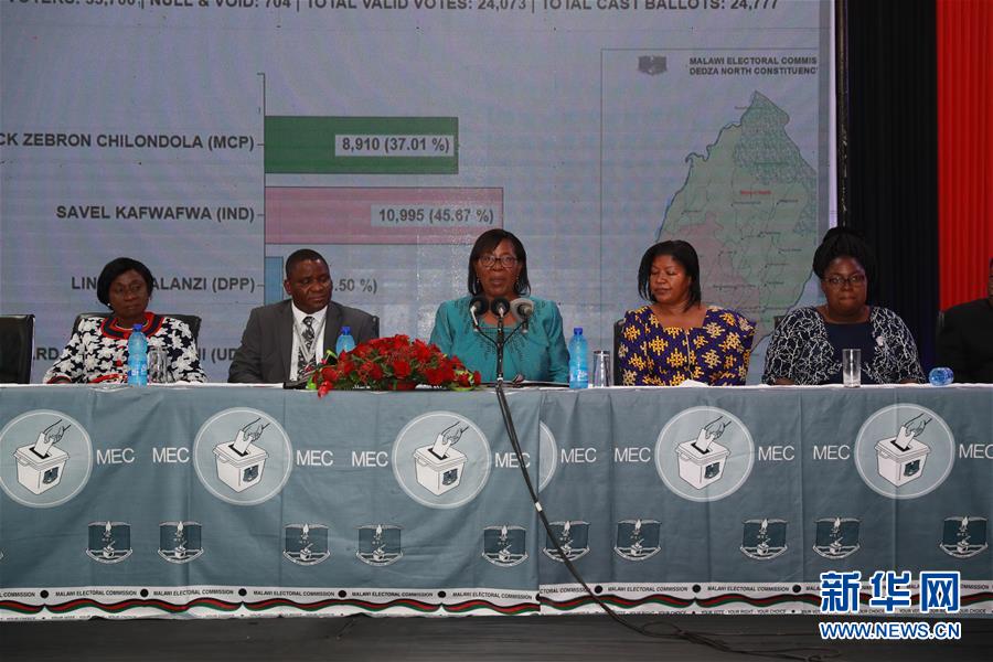5月27日,在马拉维布兰太尔,马拉维选举委员会主席简·安萨(中)宣布大选结果。马拉维选举委员会27日在布兰太尔公布了21日举行的总统选举结果,现任总统、民主进步党领导人彼得·穆塔里卡成功连任,任期5年。新华社记者彭立军摄