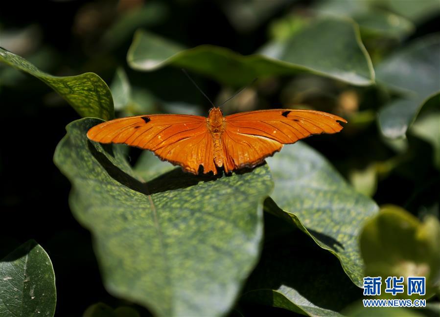 5月27日,在美国洛杉矶自然历史博物馆,一只蝴蝶停在绿叶上。洛杉矶自然历史博物馆近日举行蝴蝶展,展览将持续至9月2日。新华社记者李颖摄