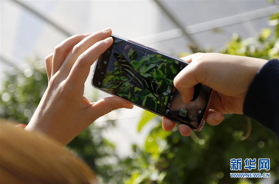 5月27日,在美国洛杉矶自然历史博物馆,一名游客在蝴蝶展上拍摄蝴蝶。洛杉矶自然历史博物馆近日举行蝴蝶展,展览将持续至9月2日。新华社记者李颖摄