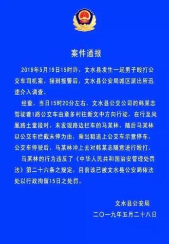 5月19日接到报警后,文水县公安局城区派出所迅速介入调查。经查,当日15时20分左右,文水县公交公司的韩某志驾驶着1路公交车由章多村往新文中方向行驶,在行至凤凰路土堂段时,未发现路边拦车的马某林,随后马某林以公交车拦截未停为由,乘出租车追上公交车示意停车,公交车停驶后,马某林冲上去对韩某志随意进行殴打。