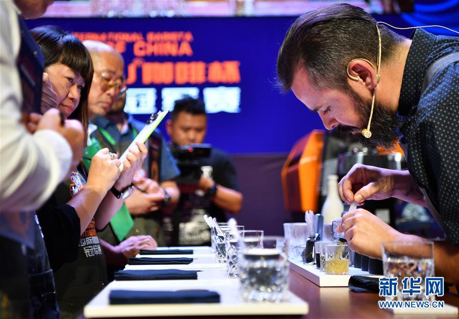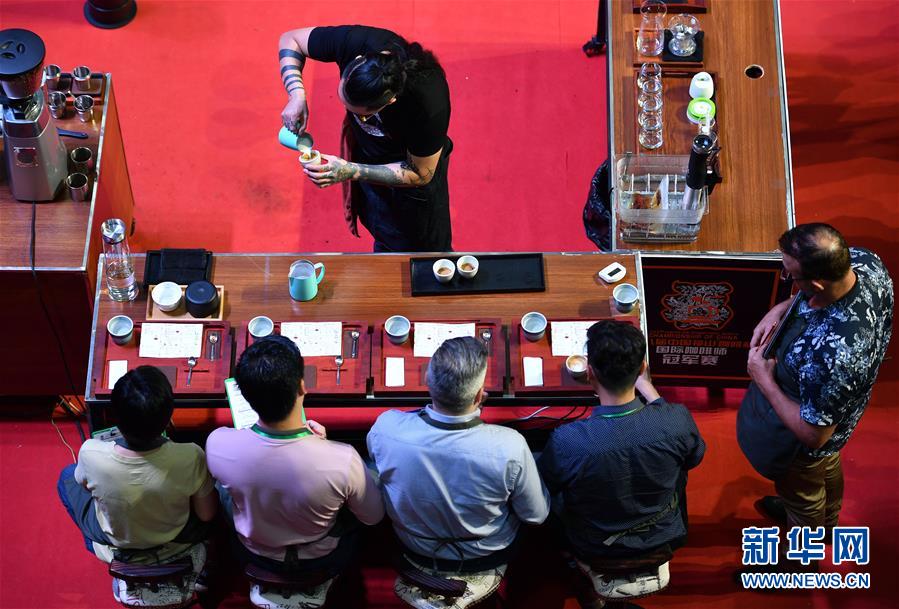 6月4日,评委在品尝选手制作的咖啡。当日,第八届中国福山咖啡杯国际咖啡师冠军赛在海南省澄迈县举行,23位国内外选手共聚福山咖啡文化风情镇,切磋、交流咖啡技艺。新华社记者郭程摄