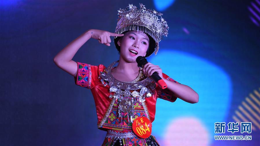 6月8日,来自钦州市的翁雨璇在参加比赛。当日,2019中国少年儿童歌曲卡拉OK电视大赛广西选拔赛在广西来宾市举行,为期两天的赛事吸引了1300多名儿童参与。新华社记者张爱林摄
