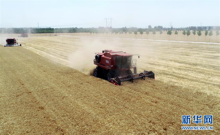 6月10日,工作人员在河北省南和县闫里乡闫里村麦田收获小麦。眼下正是河北省“三夏”农忙时节,河北省共投入200万台农业机械,确保夏粮颗粒归仓,秋粮适时播种。新华社记者朱旭东摄