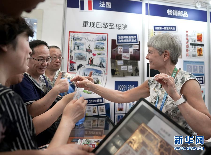 6月11日,参观者与来自法国的参展代表交流。当日,中国2019世界集邮展览在湖北武汉开幕。本届展览共有84个国家和地区参展,展出展品4683框。这是我国举办的第三次世界集邮展。新华社记者程敏摄