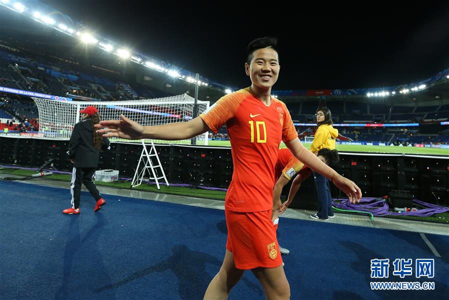 6月13日,中国队球员李影在赛后庆祝胜利。当日,在法国巴黎举行的2019年国际足联女足世界杯B组小组赛中,中国队以1比0战胜南非队。新华社记者郑焕松摄
