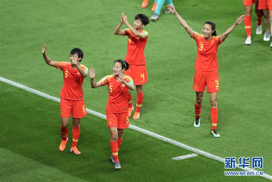 6月13日,中国队球员在赛后向观众致意。当日,在法国巴黎举行的2019年国际足联女足世界杯B组小组赛中,中国队以1比0战胜南非队。新华社记者徐子鉴摄