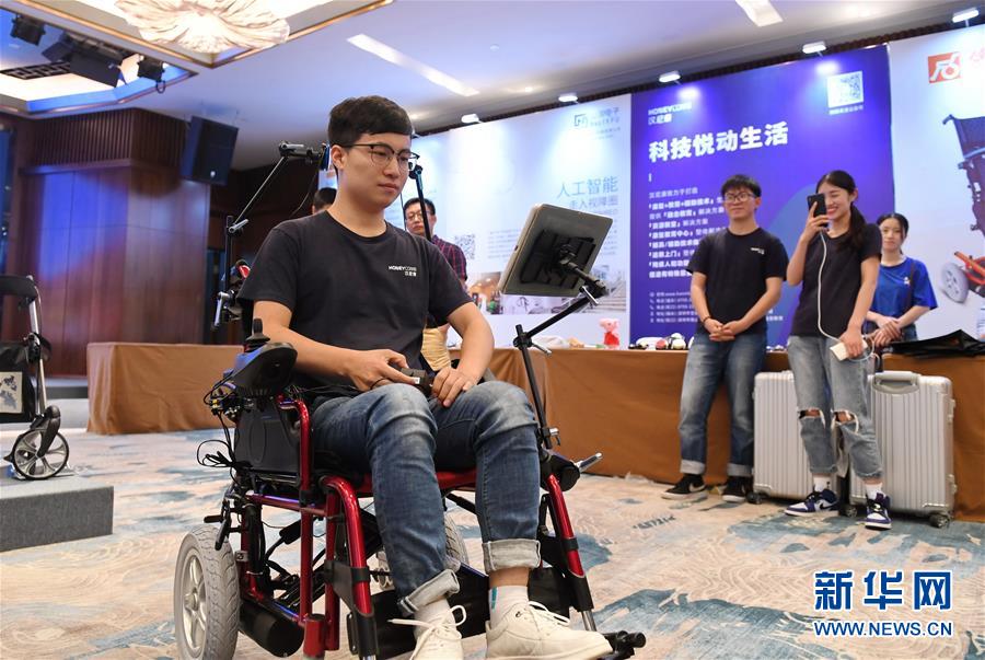 6月15日,工作人员方玮在演示高位截瘫患者通过“人机接口”技术,用呼吸来控制轮椅。 当日,两岸智能辅助器具展览会在厦门举行,展示辅具新技术、新材料、互联网+辅具服务等人工智能辅具产品,覆盖视力、听力、肢体、智力等类别。 新华社记者 林善传 摄