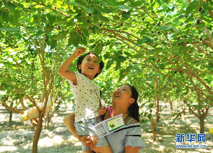 6月18日,游客在河北省泊头市一家桑葚采摘园内采摘桑葚。时下,河北省泊头市营子镇苟鲁道村桑葚成熟,当地农民抢抓晴好天气收获、晾晒。新华社记者牟宇摄
