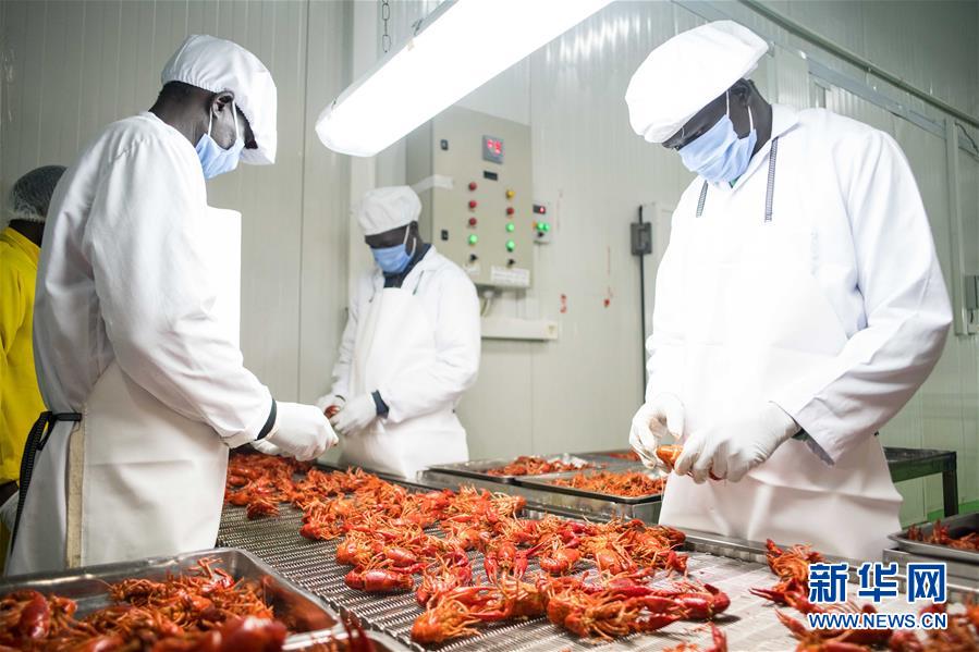 5月8日,在埃及斋月十日城,工作人员对小龙虾进行分拣。新华社记者邬惠我摄