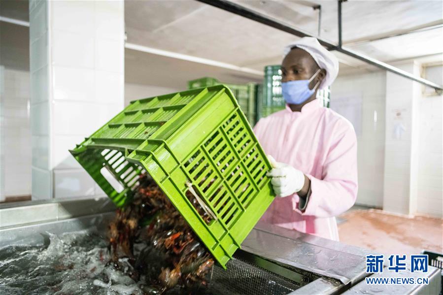 5月8日,在埃及斋月十日城,工作人员对小龙虾进行清洗。新华社记者邬惠我摄