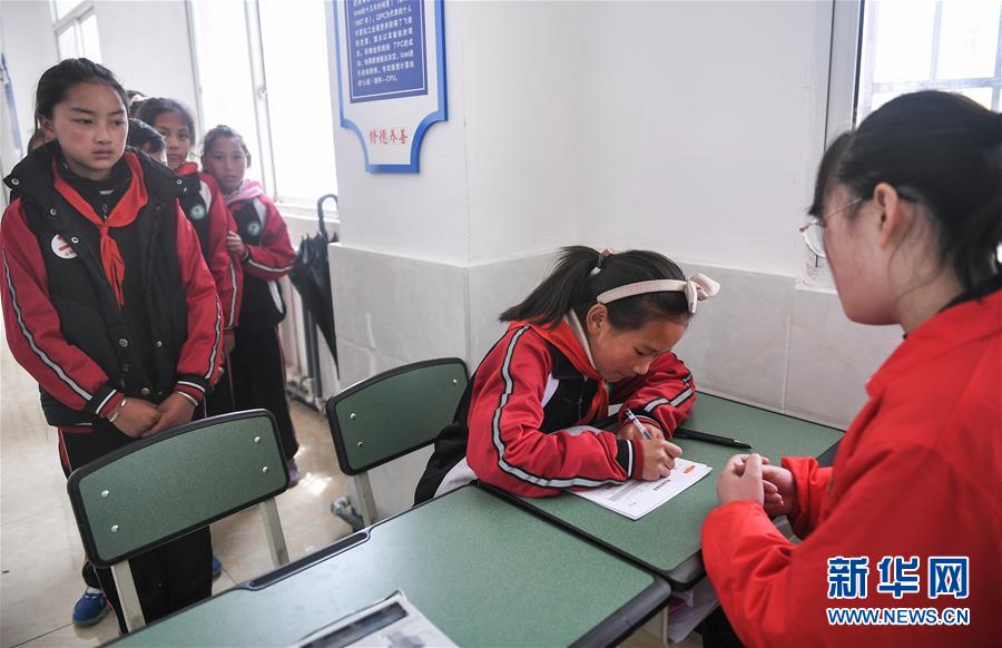 6月17日,在若尔盖县中学,扎西旺姆在配镜前填表。新华社记者薛玉斌摄