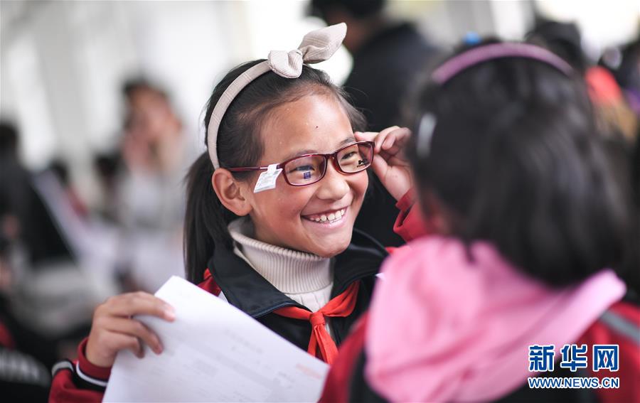 6月17日,在若尔盖县中学,戴上镜框的扎西旺姆开心不已。新华社记者薛玉斌摄