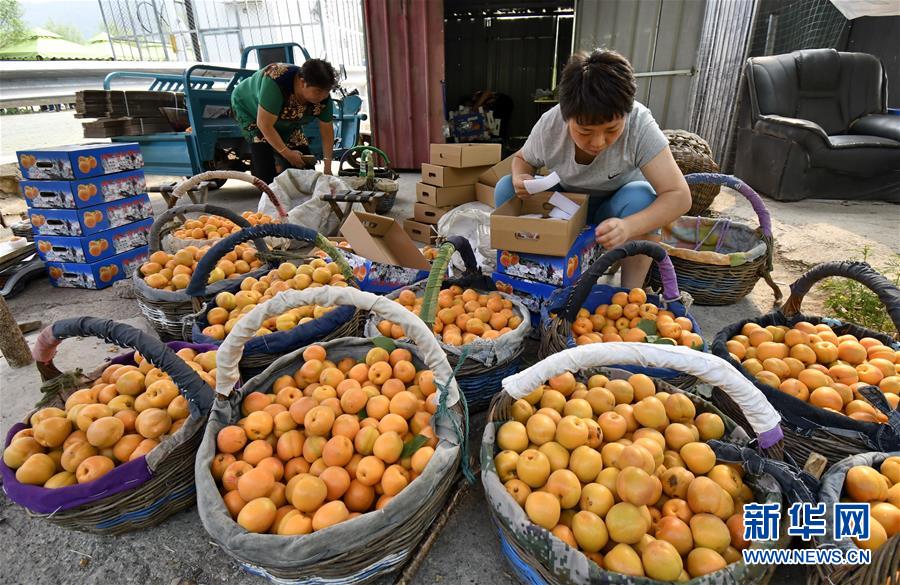 6月19日,南独乐河镇北寨村村民将成熟的红杏装盒准备销售。新华社记者李欣摄