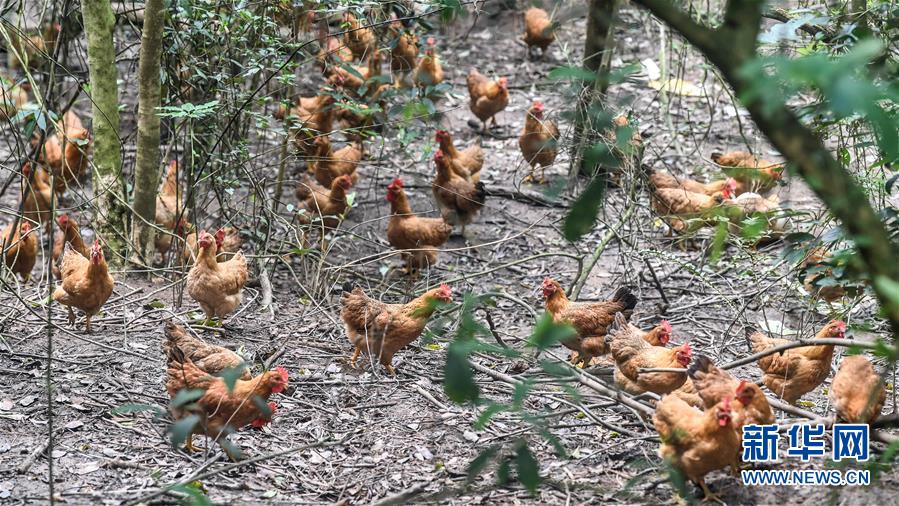 7月1日,钦州市钦南区那彭镇那彭村养殖大户文强给养殖的土鸡喂食。近年来,广西钦州市钦南区那彭镇充分利用辖区内林地,鼓励当地养殖大户优先扶持有劳动能力的贫困户发展养鸡产业,助力脱贫增收。今年那彭镇养鸡户约1800户,预计每户年出栏1.5万羽。新华社记者张爱林摄